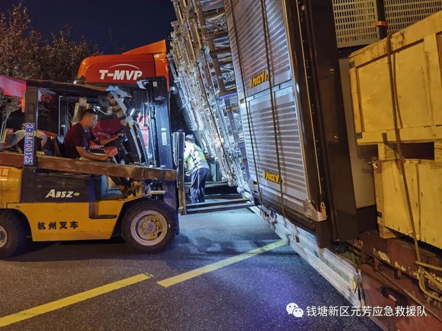 元芳救援队在接到下沙交警大队指令后,立即就近调派(下沙云  涛北路备勤点)调运2台叉车,人员4名,火速赶往现场,听从现场交警指挥, 参与此次道路应急处置工作。经现场安全评估后:采取2台叉车同时作业,先将危险倾斜货物修正,将货物整体加固!由于半挂车货运车辆上货物过多,都是重型货物,元芳救援队员在确保安全的情况下,快速熟练的驾驶着叉车,此次道路应急任务在有条不紊的情况下紧张的进行中,45分钟后半挂车辆货物调拨修正完毕,道路恢复正常通行。